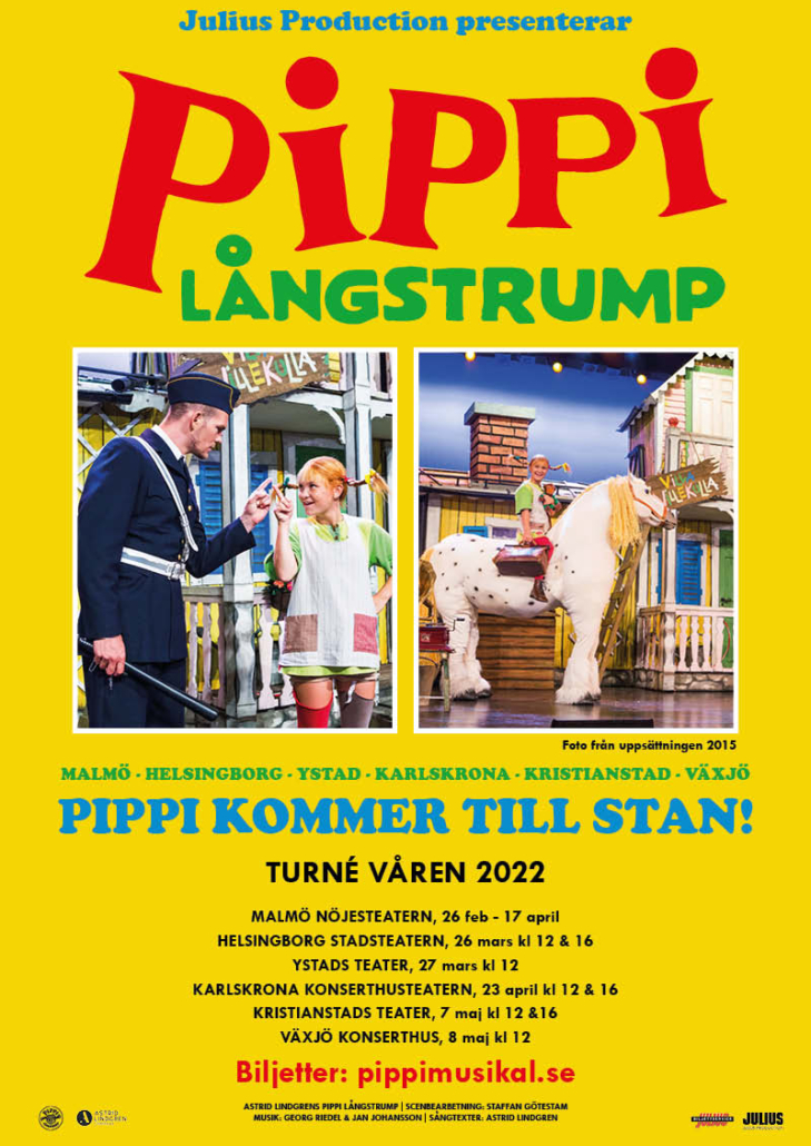 Pippi kommer till stan! var på turné våren 2022 i städerna Malmö, Helsingborg, Ystad, Karlskrona, Kristianstad och Växjö.