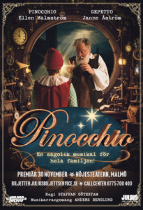 Julius Production presenterar stolt: Pinocchio – en sagolik musikal för hela familjen! Den klassiska berättelsen om trädockan som drömmer om att bli en riktig pojke får nytt liv i en storslagen och spännande scenproduktion. Regisserar gör guldmaskbelönade Staffan Götestam, som också har skrivit manus och musik. Musiken är också signerad Anders Berglund – en av Sveriges mest älskade musikskapare inom scen, film och tv. Sångtexterna är skriva av Peter Flack.